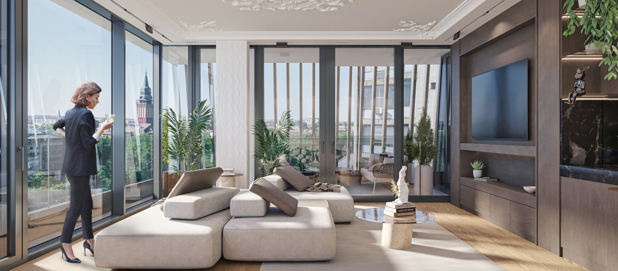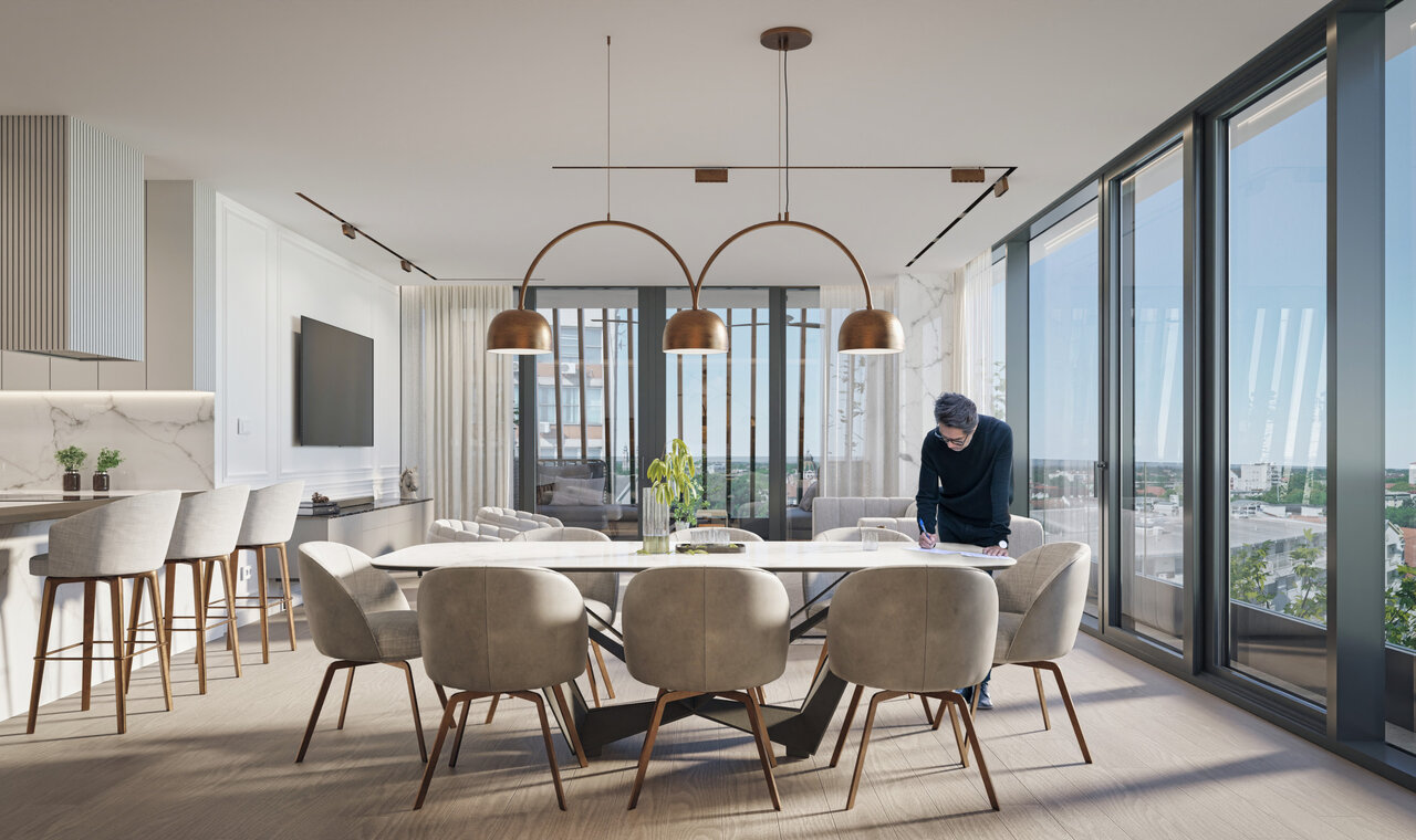 Designed with entertaining in mind, the penthouse kitchens are perfect for gatherings large and small. Filled with light from every direction and wide open to views of the city below, the penthouse kitchens always deliver a dramatic backdrop. Clean and contemporary layouts are finished in a palette of natural materials and include a breakfast nook, oversized central island, and Miele appliances throughout including a full-height wine refrigerator.
